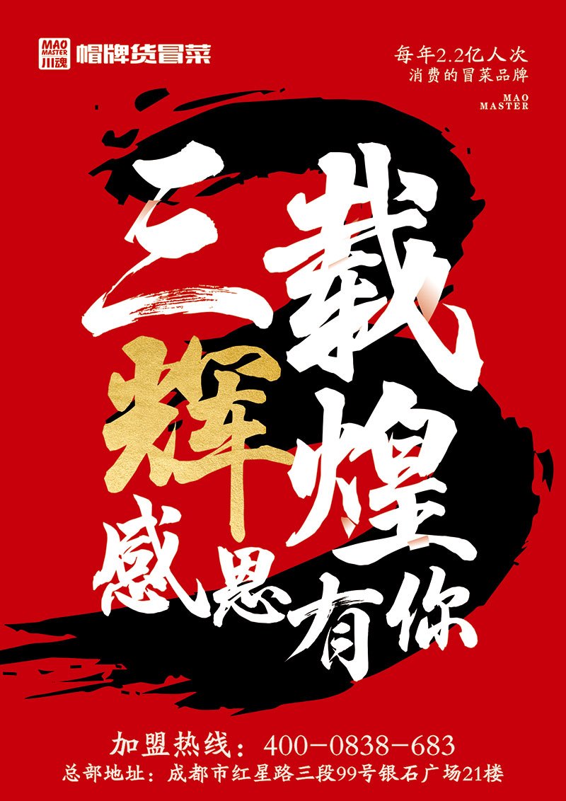 2018年6月18日,川魂集團(tuán)——帽牌貨冒菜正式成為掛牌上市三周年的冒菜企業(yè),千店同慶。三載輝煌·感恩有你,三周年慶典活動(dòng)繽紛多彩,鉅惠同行。